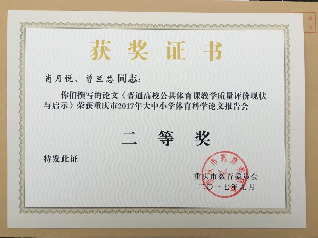 我校体育部有12名青年教师撰写的论文参加了此次评选,最终肖月悦老师撰写的论文《普通高校公共体育课教学质量评价现状与启示》喜获二等奖,范金刚、程蕾、韩书娜、胡晓洋、青竹、易强6名老师撰写的论文均获得三等奖。