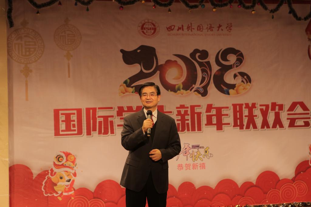 李克勇校长在致辞中代表学校向参加新年联欢会的各位老师、同学表示热烈的欢迎,并致以节日的问候。他希望同学们积极参加学校的各项活动,不断丰富自己的留学生活。同时也希望同学们把各自国家的文化介绍到川外,为创造一个真正国际化的校园而努力。