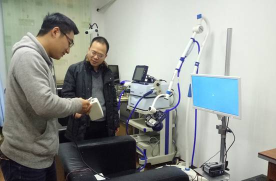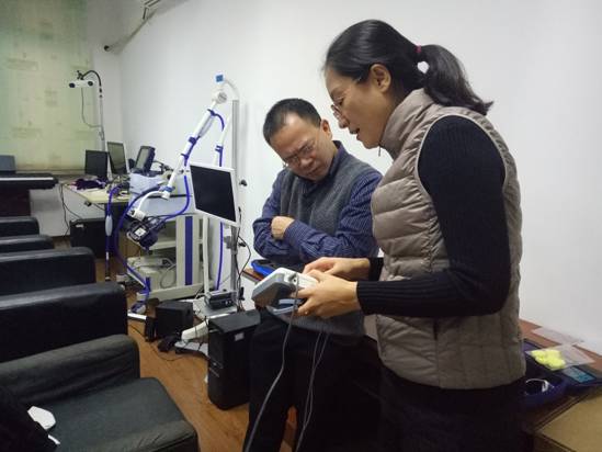 随后,在康健楠博士和陈贺博士的带领下,团队还先后参观了神经调控实验室和神经信息与工程实验室。康健楠博士主要从事自闭症的研究,陈贺博士主要从事多动症的研究。康博士和陈博士为团队详细介绍了神经调控实验室配备的八通道脑电采集系统、经颅直流电刺激(tDCS)、脑电神经反馈训练系统、经颅磁刺激(TMS)等实验仪器的主要用途及使用注意事项。八通道脑电采集系统采用的放大器集多样的连接方式、完备的阻抗检测、完善的状态检测、通用的文件格式、使用主动电极等多个优势于一体,体积小巧,便于携带。经颅直流电刺激采用的是一种非侵入性的,利用恒定、低强度直流电(1-2 mA)调节大脑皮层神经元活动的技术,安全性能极高,可用于言语康复治疗。脑电神经反馈训练系统可用于注意力的提升等,是目前世界上最新的一种对大脑进行全面提升的技术,训练之后再进行言语行为训练,可提升言语障碍人群的恢复效果。经颅磁刺激采用无痛、无创的绿色治疗方法,磁信号可以无衰减地透过颅骨而刺激到大脑神经,实际应用除头脑的刺激外,还可应用于外周神经肌肉的刺激、中风的康复、抑郁治疗等。神经信息与工程实验室为设备研发中心,团队成员除了进行技术研发之外,还可以根据具体研究需要对程序和设备进行调整和定制。