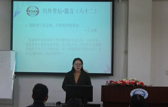 2017级硕士研究生王术芬同学首先分享了两则箴言。一则是来自王永彬的“饱暖则气昏志惰,饥寒则神紧骨坚”,告诫大家安乐易使人怠惰丧志,而逆境则常催人奋进。另一则是WayneDyer的名言:“Whatwe think determines what happens to us, so if we want to change our lives, weneed to stretch our minds”,寓意是思想方向决定人生方向,思想高度决定人生高度。