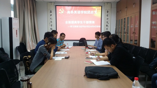 2014年10月8日,中共中央总书记、国家主席、中央军委主席习近平在党的群众路线教育实践活动总结大会上发表了重要讲话。结合商务英语学院自成立以来着力加强大学生情商教育工作的系列活动规划,商务英语学院团总支、学生会主席团于2014年10月23日中午12点,在西区行政楼b602会议室召开了关于学习贯彻习近平总书记在党的群众路线教育实践总结大会讲话精神,促进全面提高学生干部情商的主题会议。商务英语学院团总支书记呙明君以及商务英语团总支学生会主席团全体成员参加了本次会议。