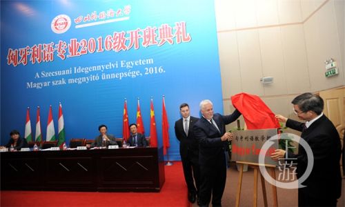 21日下午,四川外国语大学举行匈牙利语开班典礼,匈牙利外交外经部副国务秘书朱托拉.瑞尔特、匈牙利驻重庆总领事馆总领事罗澜等出席。匈牙利大使馆、驻京文化中心、驻重庆总领事馆承诺帮助建设图书资料,派送外交给予教学支持,推动相关语种专业的建设。